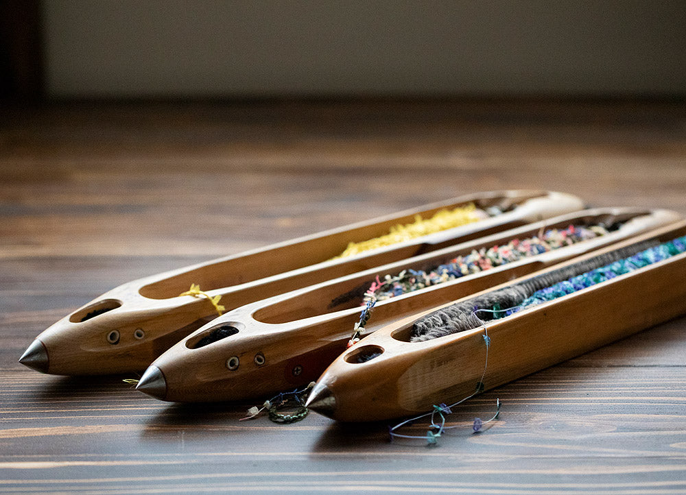 「シャトル」とは、緯糸を転送するための道具であり、緯糸をシャトル内の部品(管)に巻き付け、左右に飛び交わせながら、生地へと織り上げていきます。